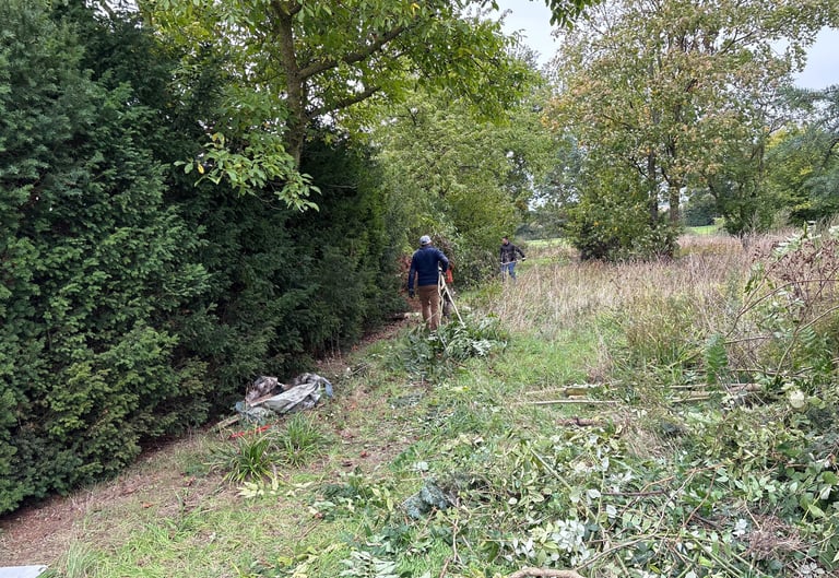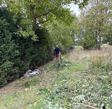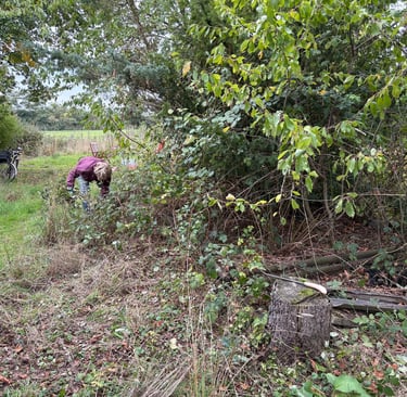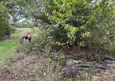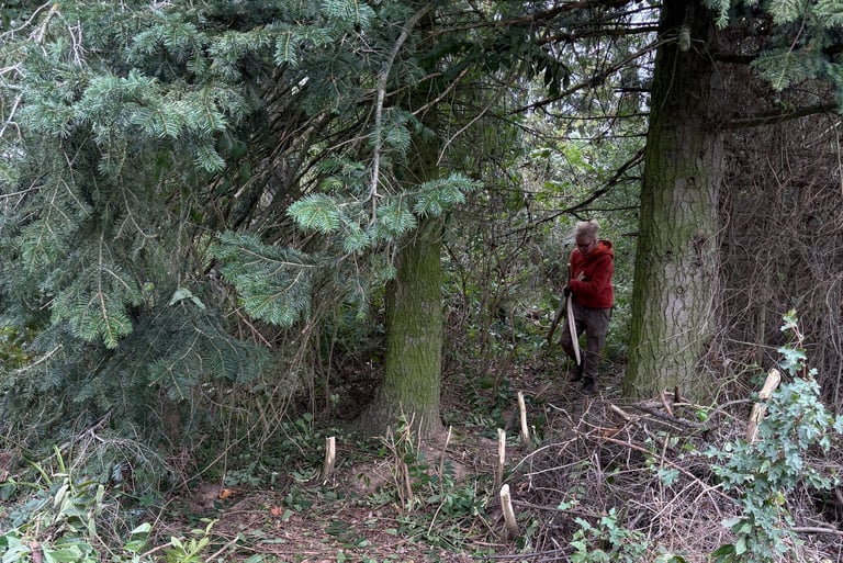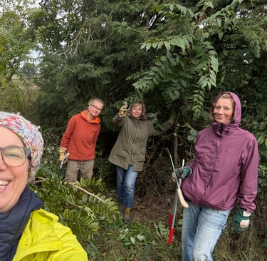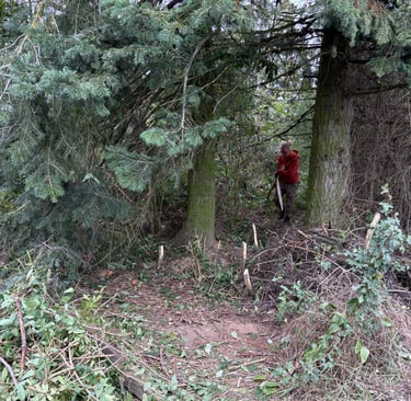 Die kleinen Essigbäume und viele Brombeeren wurden schon beim ersten Aktionstag gefällt und zurückgeschnitten - jetzt geht es vermehrt an den Kirschlorbeer und die Koniferen - und natürlich wartet auch immer noch genug Brombeere auf uns :-)