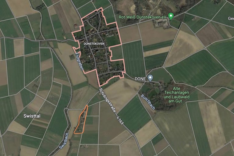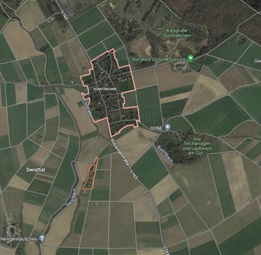 Den Garten Kunterbunt findet ihr in der Nähe von Swisttal Dünstekoven zwischen der L163 und der kleinen Swistbrücke. Im Bild ist der Garten orange markiert. Die Swist, das Naturschutzgebiet Kiesgrube Dünstekoven des NABU und der Kottenforst sind nicht weit und laden zu wunderschönen Spaziergängen ein...