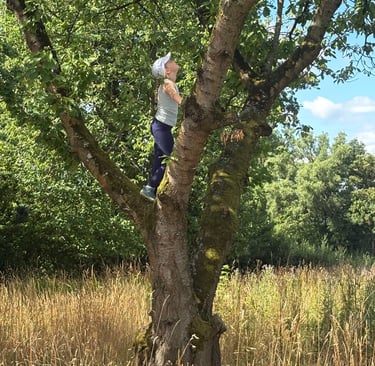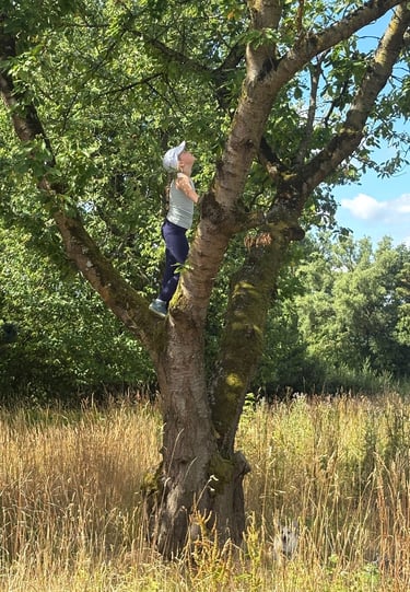Ute Gerst baute mit den Kindern zusammen kleine Boote aus Naturmaterialien, die zuerst im Garten entdeckt werden wollten. Außerdem gab es noch eine kleine Einführung ins Hundetraining mit Angela Gilges und dem kleinen Welsh Corgi Kalle. Das Balancieren auf der Slackline zwischen den Süßkirschenbäumen hat den Kindern mindestens so viel Spaß gemacht wie das Klettern auf dem großen, alten Sauerkirschenbaum und (für Fortgeschrittene) auf dem Walnussbaum. Der ganze wilde Garten Kunterbunt wurde von den Kindern erforscht und so manch ein springendes Heupferd freudig entdeckt. Und last but not least gab es ganz viel Kuschelzeit mit der verschmusten Retrieverhündin Nala...