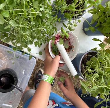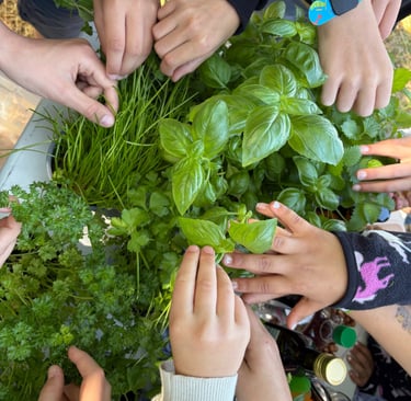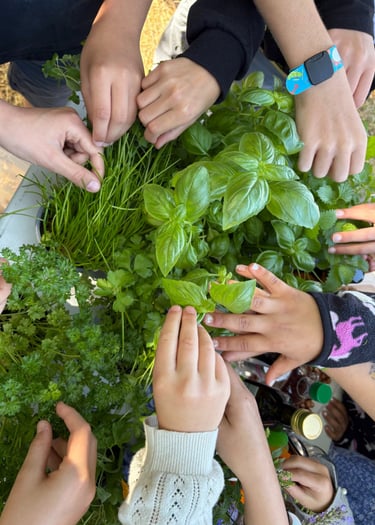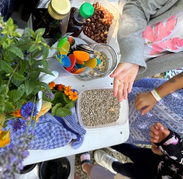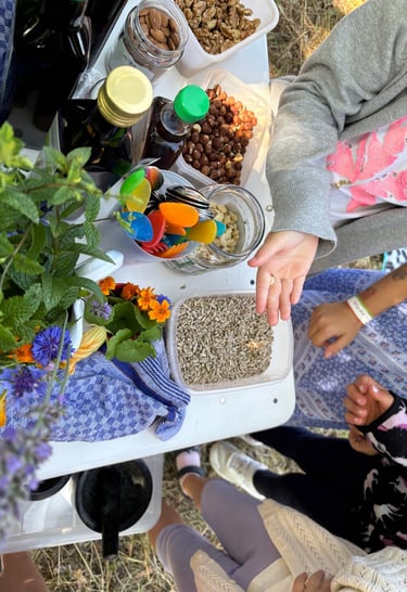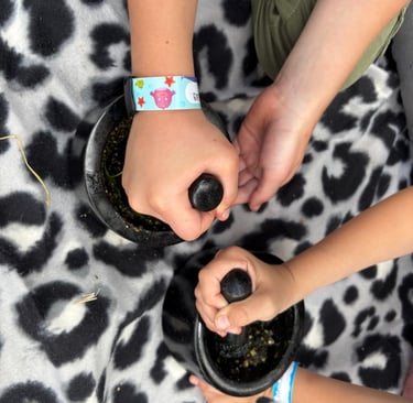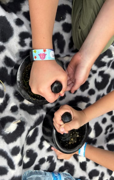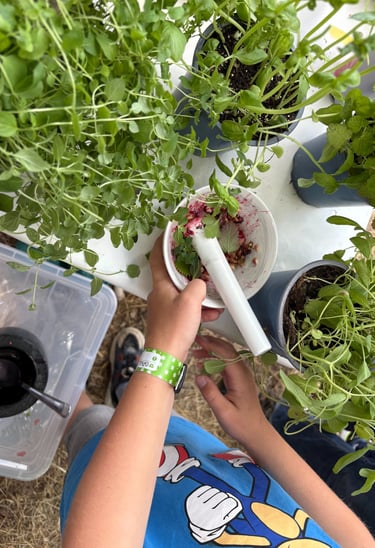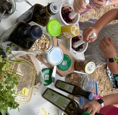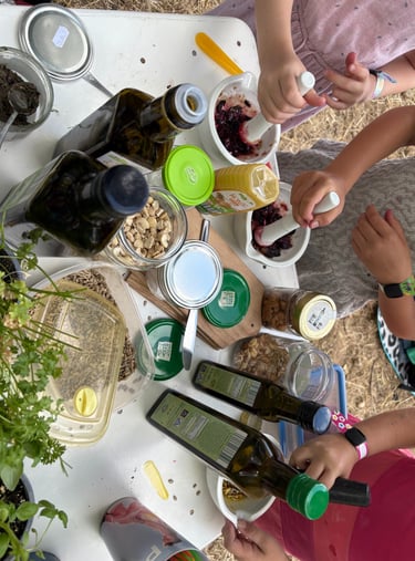 Am ersten Tag zauberten die Kinder zusammen mit Angela Gilges eigene Pestokreationen aus Küchenkräutern, Nüssen, Ölen, Honig, essbaren Blüten und Beerenfrüchten - und zwar genauso, wie es schon die Menschen machten, die vor 6000 Jahren auf dem Grundstück gelebt haben (und deren neolithisches Langhaus noch im Boden unter den Füßen der Kinder schlummert): mit dem Mörser, Feingefühl und Muskelkraft. Dank der Fantasie und der Experimentierfreude der jungen Köch:innen sind eine ganze Menge Köstlichkeiten dabei rausgekommen. Es war richtig lecker!